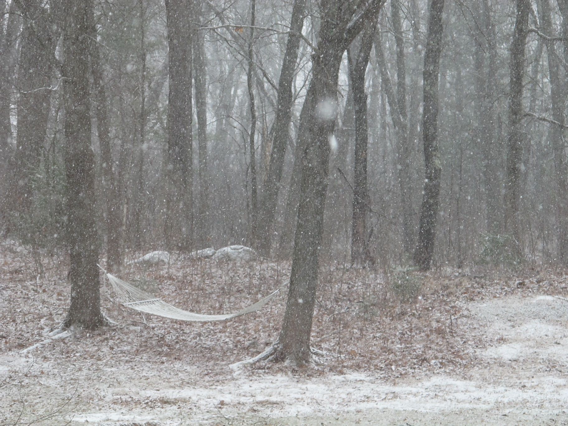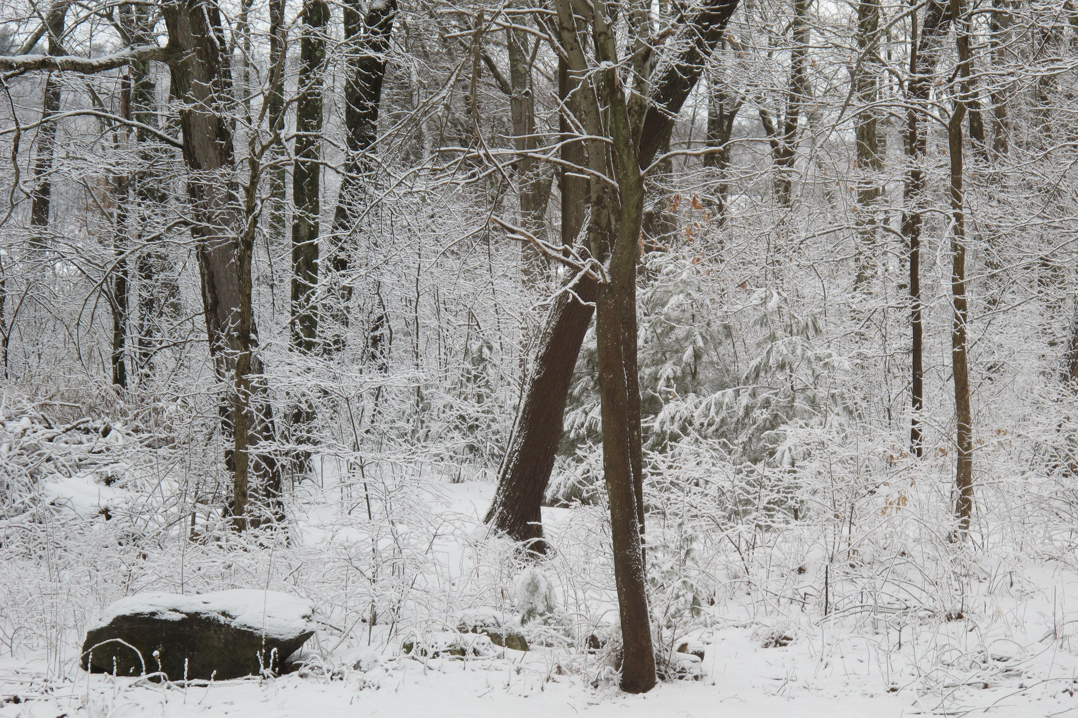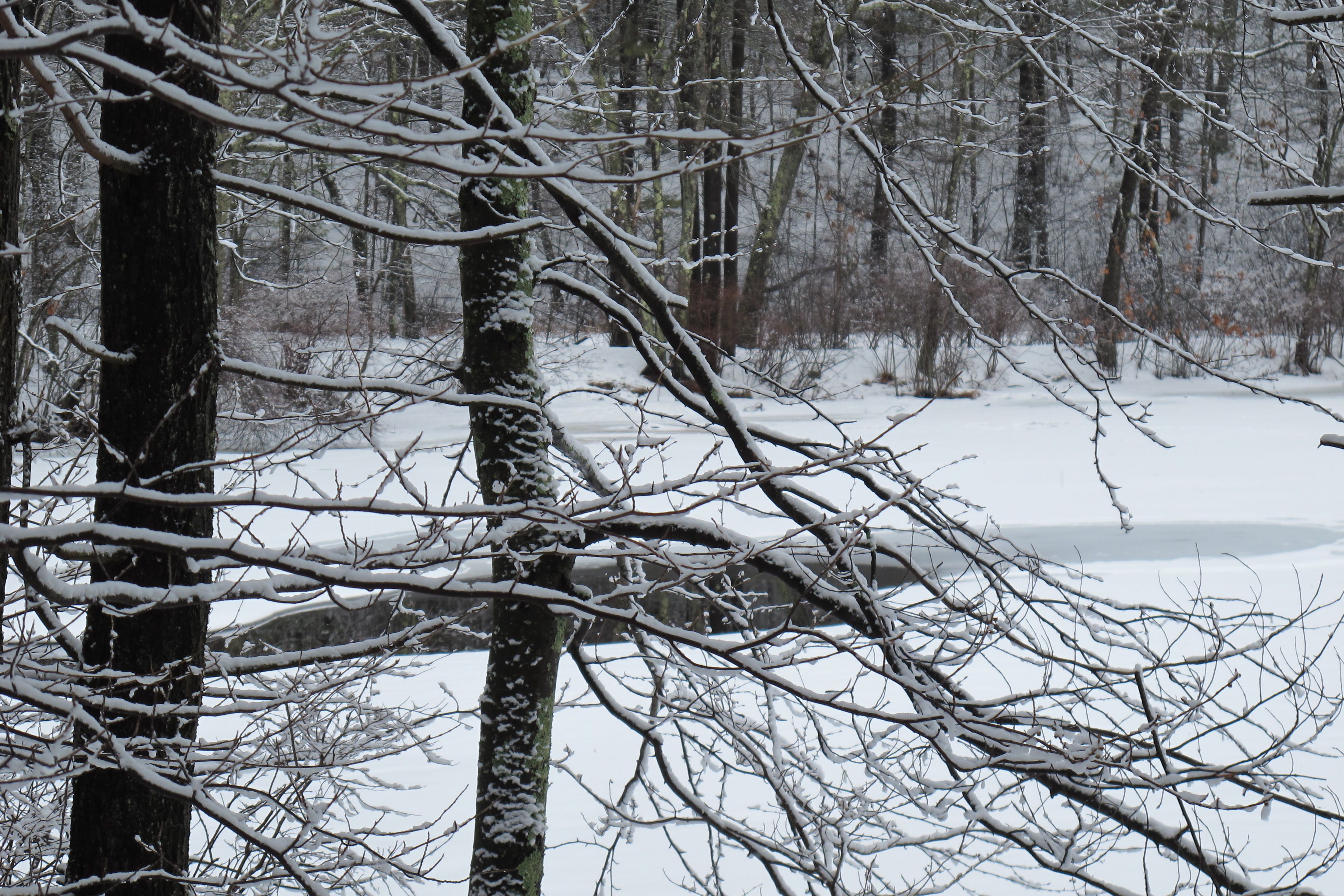 It’s another snowy Monday in the neighborhood. The weekend’s storm only left a few inches, but it’s sticky stuff. It clung to tree branches and blackened their trunks with its wetness.